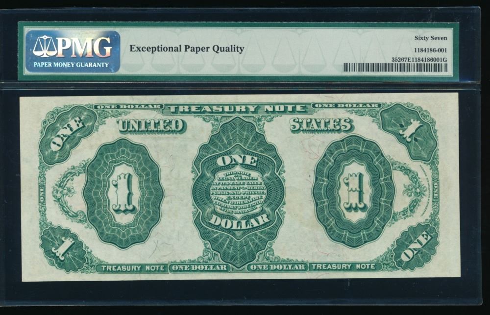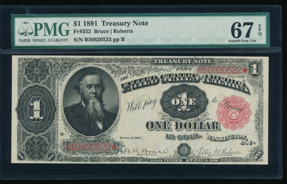 One 1891 $1 Treasury Note PMG 67EPQ.