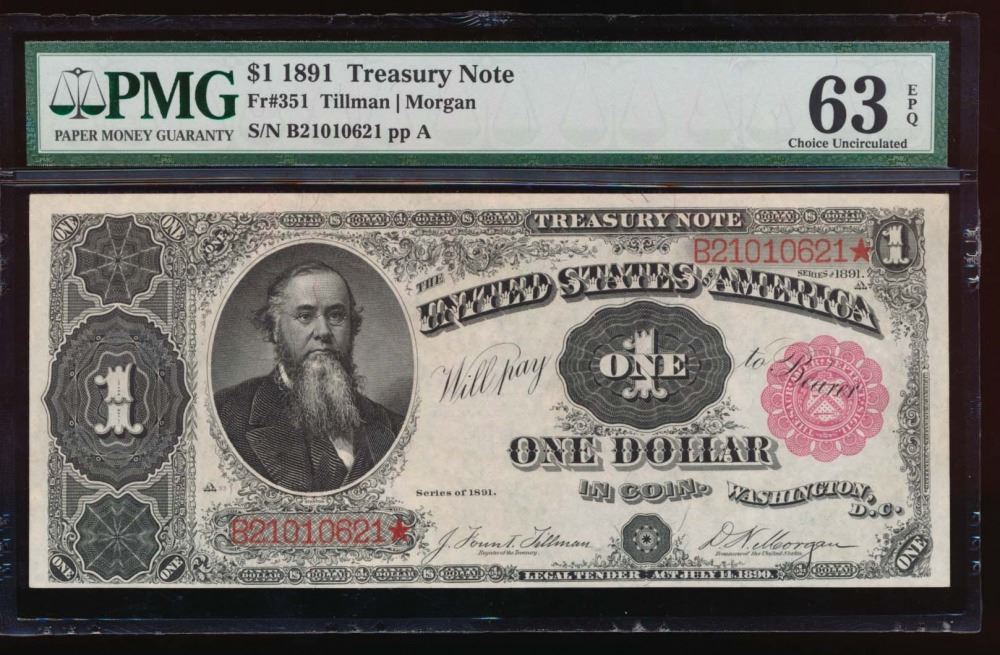 One 1891 $1 Treasury Star Note PMG 63EPQ.