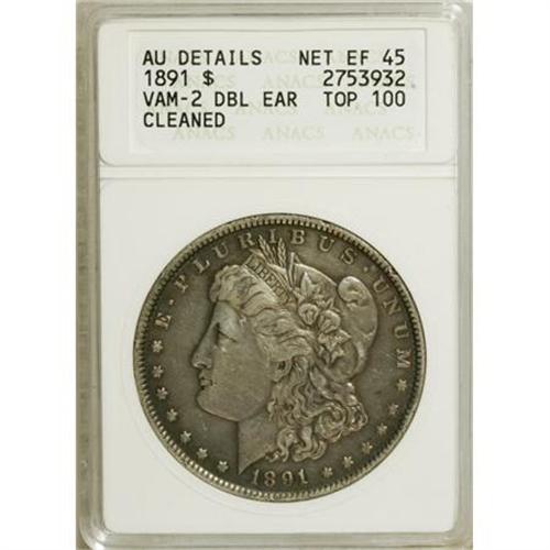 <B>1891 $1 Doubled Ear--Cleaned--ANACS. AU Details, Net XF45.</B></I> VAM-2A. A Top 100 Variety. NGC Census: (0/0). PCGS Population (5/15). (#133936)<BR><BR><b>Shipping:</b> Coins & Currency (<a target="_blank" href="http://www.heritageauctions.com/common/shipping.php">view shipping information</a>)