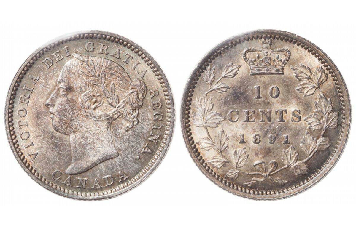 1891 10¢ 21 Lvs ICCS MS64. Amazingly toned. Well struck with exceptional surfaces and clean fields. The coin has full original lustre. Pop. Top 6