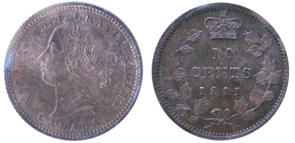 1891 10¢ 21Lvs ICCS MS64. Intense golden shades. Excellent strike with clean fields and nice surfaces.