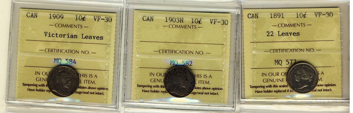 1891 10¢ 22 Lvs, 1903H & 1909 VL ICCS VF30. Lot of 3 coins.