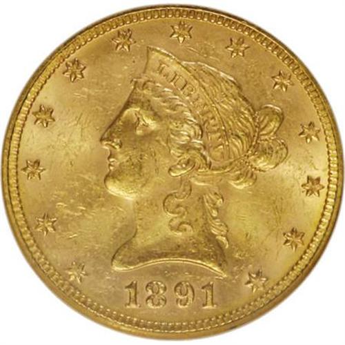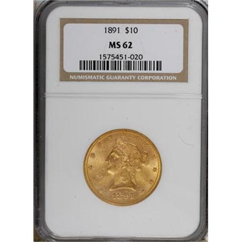 <B>1891 $10 MS62 NGC.</B></I> NGC Census: (148/30). PCGS Population (86/31). Mintage: 91,868. Numismedia Wsl. Price for NGC/PCGS coin in MS62: $500. (#8719)<BR><BR><B>Coin Engraver:</B> Christian Gobrecht<BR><BR><b>Shipping:</b> Coins & Currency (<a target="_blank" href="http://www.heritageauctions.com/common/shipping.php">view shipping information</a>\)