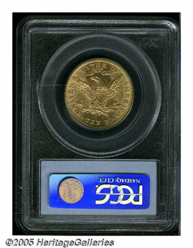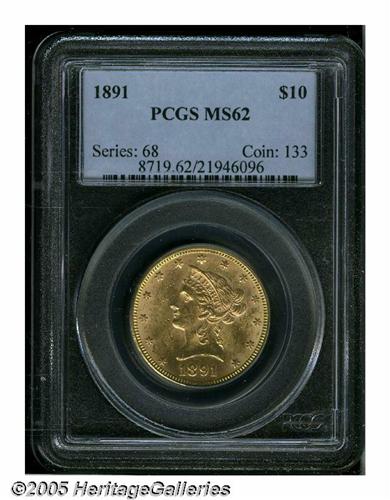 <B>1891<$10> MS62 PCGS.</B></I> Scattered abrasions rule out a higher grade, but this is a well struck, lustrous example with original brassy-gold color. The 1891-P is a scarcer date with fewer than 100,000 pieces produced. As of May 2005, PCGS and NGC combined have certified only 45 examples finer. Population: 80 in 62, 23 finer (5/05).