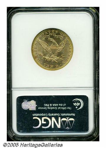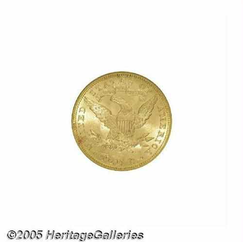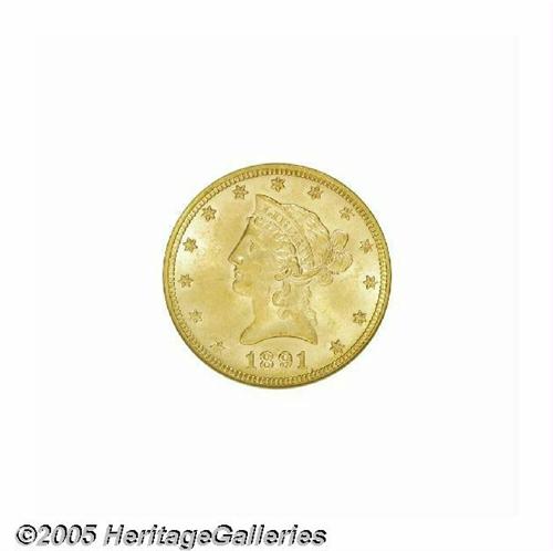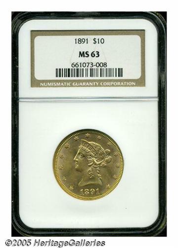 <B>1891<$10> MS63 NGC.</B></I> A conditionally challenging coin for the date collector. Note the quality of the surfaces and luster, for very few 1891 eagles can approach this coin. Sharply struck by the dies and highly appealing. Population: 22 in 63, 1 finer (6/05).
