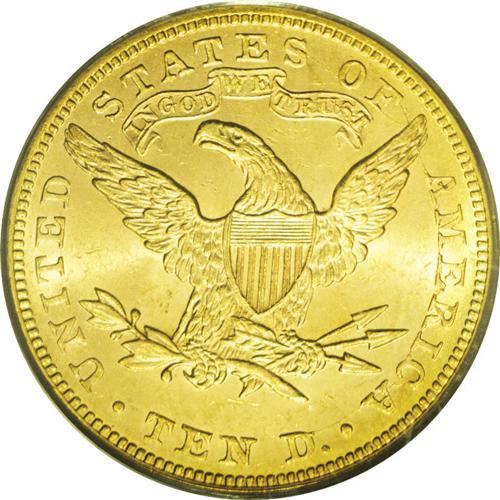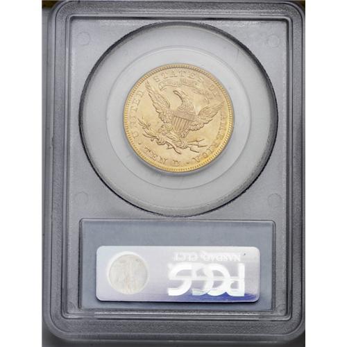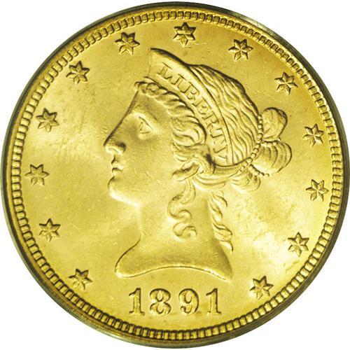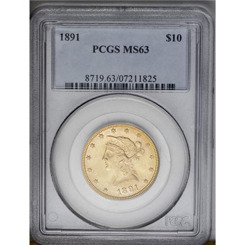<B>1891<$10> MS63 PCGS.</B></I> A relatively low mintage issue (91,820 pieces), the 1891 is available in Mint State but typically comes thoroughly abraded. The present sharply struck pink-gold example has no mentionable contact aside from a typical mark count on the obverse. The luster is satiny, and is especially prominent on the reverse.