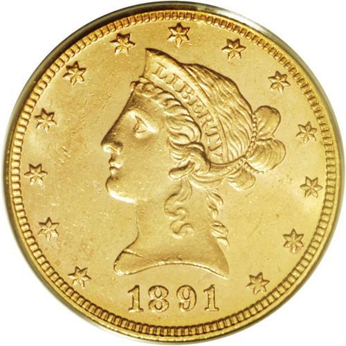 <B>1891 $10 MS63 PCGS.</B></I> The 1891 ten dollar is a relatively scarce date, though Uncirculated pieces through MS62 can be acquired with a little patience and searching. MS63 examples, however, are genuinely elusive. Indeed, only 50 or so coins have been graded MS63 by PCGS and NGC, and a mere five pieces finer! Attractive apricot-gold surfaces on this coin display partially prooflike fields that yield strong contrast with sharply struck, mildly frosted design elements. A scattering of light, inoffensive contact marks preclude a higher grade.<BR><BR><b>Shipping:</b> Coins & Currency (<a target="_blank" href="http://www.heritageauctions.com/common/shipping.php">view shipping information</a>)