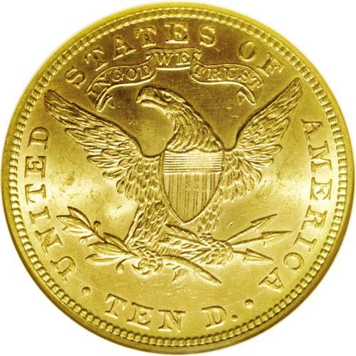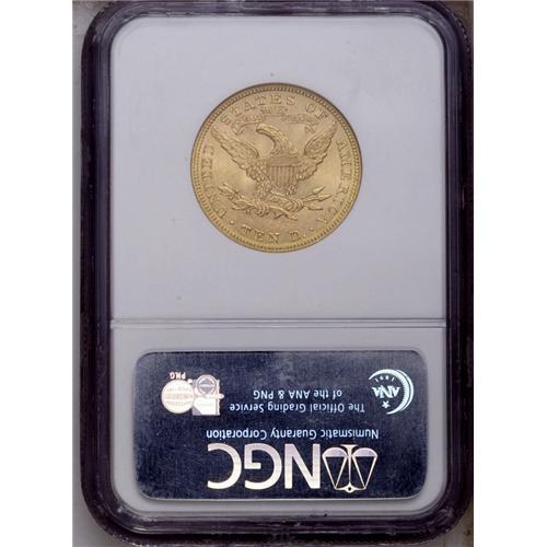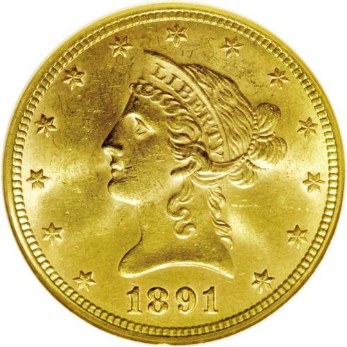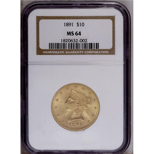 <B>1891 $10 MS64 NGC.</B></I> Only one finer example of this issue has been certified by NGC, and PCGS has never graded a Gem. This example is one of the finest survivors from a mintage of 91,820 coins. Since we started our Auction Archives a dozen years ago, we have only offered a single other example at this grade level in our Signature auctions. The reverse has noticeable die cracks through RICA TEN D U. Both sides have a frosty green-gold appearance with only the slightest surface marks. This coin is fully lustrous and highly attractive. Census: 2 in 64, 1 finer (12/05).