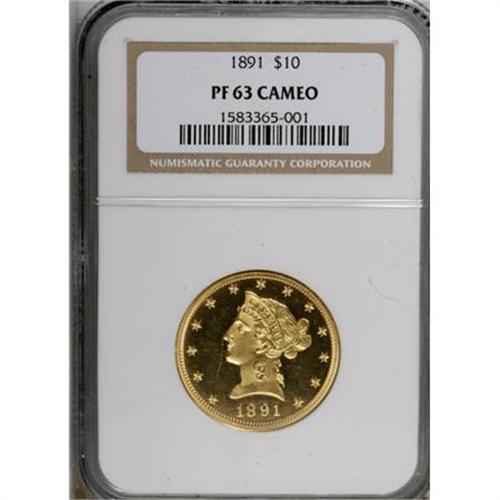 <B>1891 $10 PR63 Cameo NGC.</B></I> This piece would have garnered a full Gem or finer grade except it has a thin scratch in the obverse field. Otherwise, both sides are virtually perfect. It is fully brilliant with pristine, mirrored fields that surround frosty and sharply defined devices. Exceptional contrast, nearly in the Ultra Cameo category. Only about 15 to 20 proofs of this issue survive from a mintage of 48 coins. The existing population includes two Deep Cameo pieces in the Smithsonian Institution. Other known proofs include the Eliasberg-Bass coin, and the Trompeter, Garrett, Pittman, and Carter specimens.<BR><BR><b>Shipping:</b> Coins & Currency (<a target="_blank" href="http://www.heritageauctions.com/common/shipping.php">view shipping information</a>)