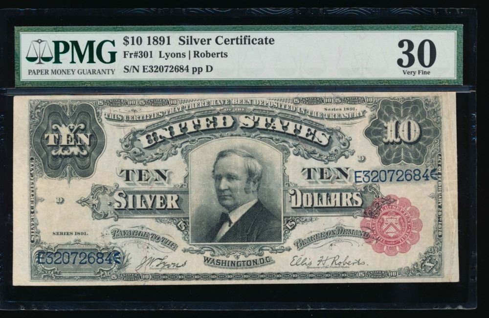 One 1891 $10 Silver Certificate PMG 30 Very Fine.