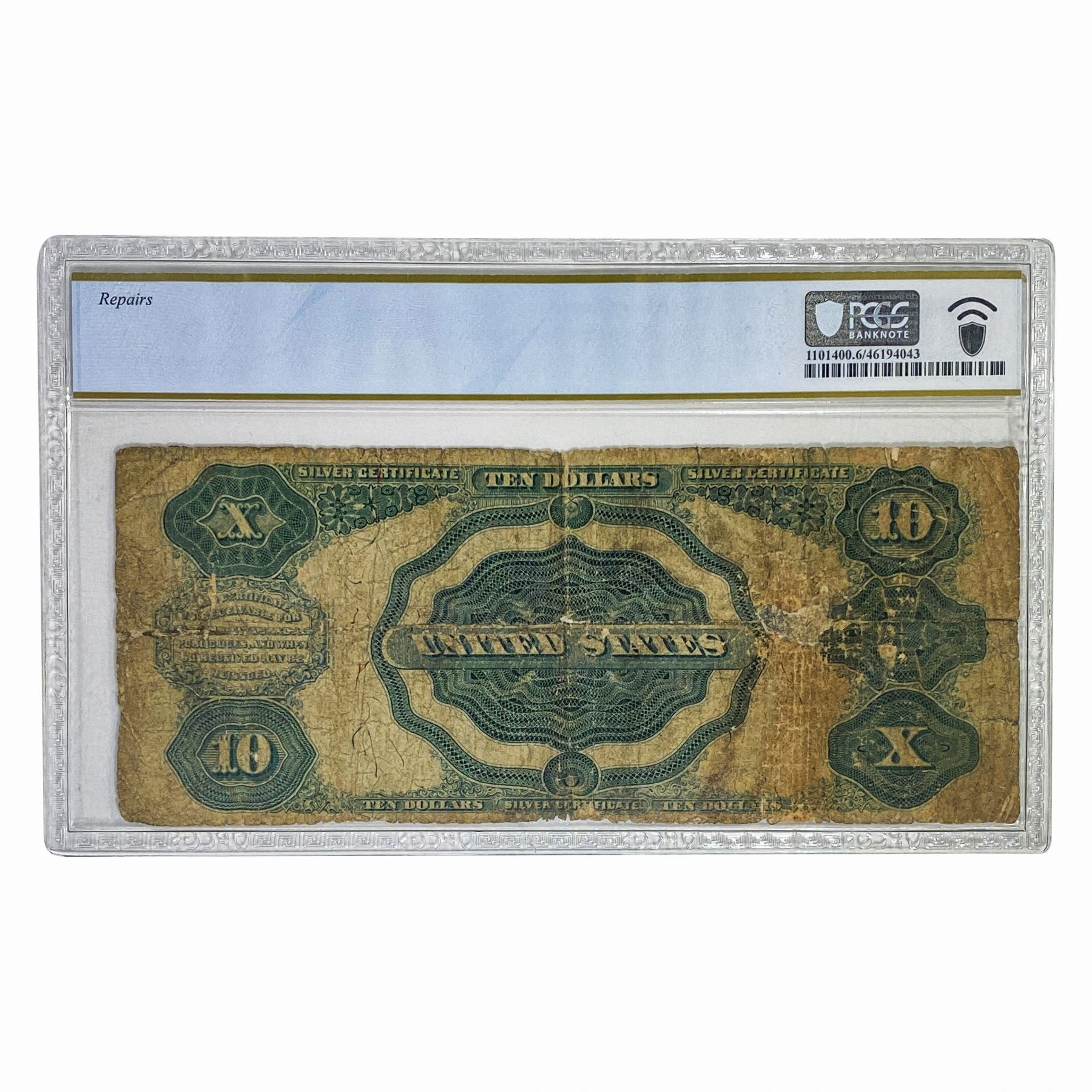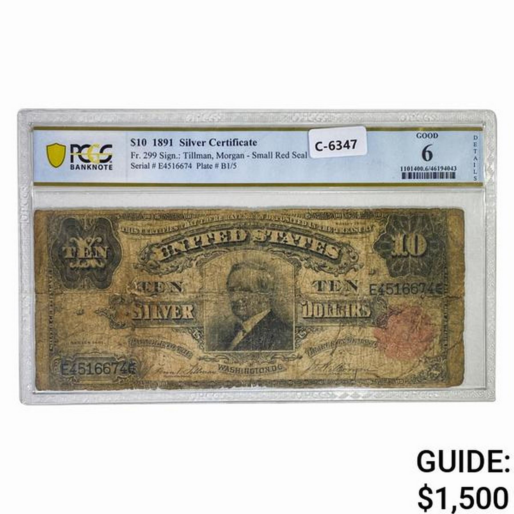 1891 $10 TOMBSTONE SILVER CERT. PCGS GOOD-6