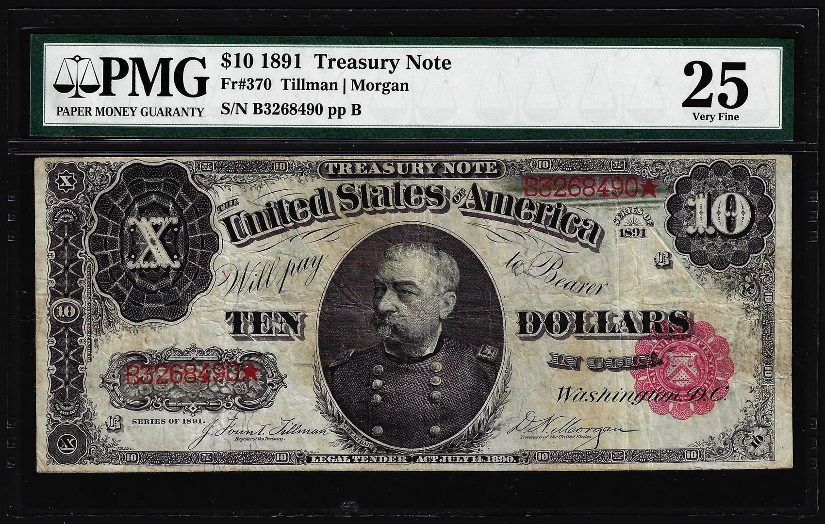 One 1891 $10 Treasury Note Fr.370 PMG Very Fine 25. PMG Certified.