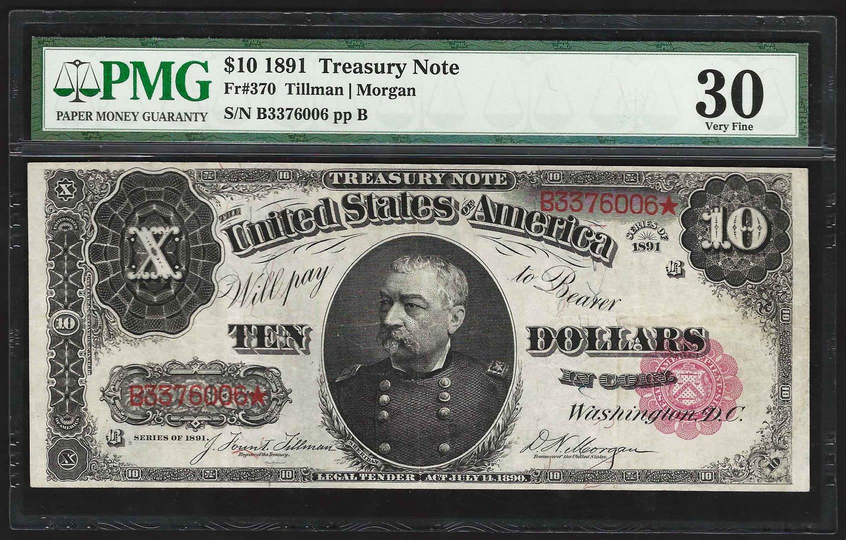 One 1891 $10 Treasury Note Fr. 370 PMG Very Fine 30. PMG Certified.