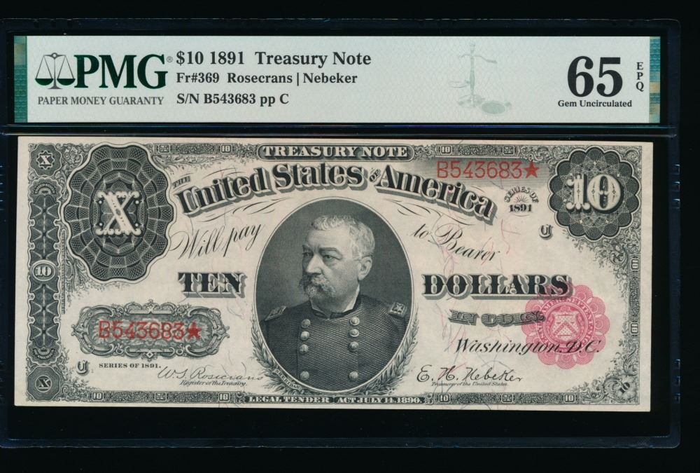 One 1891 $10 Treasury Note PMG 65EPQ.