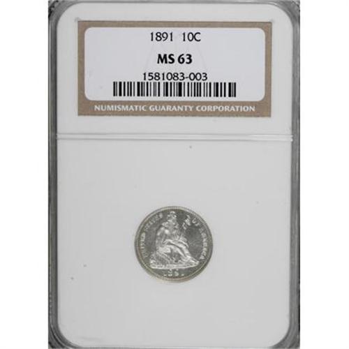 <B>1891 10C MS63 NGC.</B></I> NGC Census: (141/429). PCGS Population (152/335). Mintage: 15,310,600. Numismedia Wsl. Price for NGC/PCGS coin in MS63: $200. (#4706)<BR><BR><B>Coin Engraver:</B> Christian Gobrecht<BR><BR><b>Shipping:</b> Coins & Currency (<a target="_blank" href="http://www.heritageauctions.com/common/shipping.php">view shipping information</a>)
