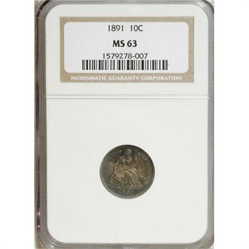 <B>1891 10C MS63 NGC.</B></I> . NGC Census: (142/435). PCGS Population (155/352). Mintage: 15,310,600. Numismedia Wsl. Price for NGC/PCGS coin in MS63: $200. (#4706)<BR><BR><B>Coin Engraver:</B> Christian Gobrecht<BR><BR><b>Shipping:</b> Coins & Currency (<a target="_blank" href="http://www.heritageauctions.com/common/shipping.php">view shipping information</a>)