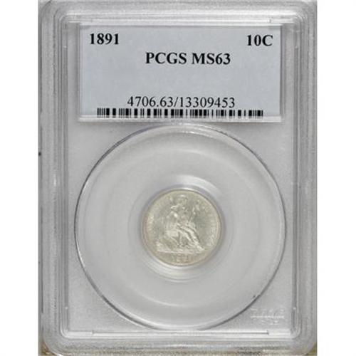 <B>1891 10C MS63 PCGS.</B></I> . PCGS Population (155/352). NGC Census: (142/435). Mintage: 15,310,600. Numismedia Wsl. Price for NGC/PCGS coin in MS63: $200. (#4706)<BR><BR><B>Coin Engraver:</B> Christian Gobrecht<BR><BR><b>Shipping:</b> Coins & Currency (<a target="_blank" href="http://www.heritageauctions.com/common/shipping.php">view shipping information</a>)
