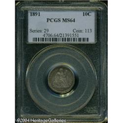 1891 10C MS64 PCGS. Deep aquamarine and dove-gray <B>1891 10C MS64 PCGS.</B></I> Deep aquamarine and dove-gray colors bathe this satiny and boldly struck near-Gem. Carefully preserved, a hint of rough surface on the obverse rim at 5 o'clock does not distract. <BR><BR><B>Important notice:</B> Heritage usually auctions material at the rate of 200-250 lots per hour. On some occasions eBay Live bid software or the Internet may not be able to keep up with the pace of the auction. We recommend placing a realistic absentee bid now as insurance to avoid disappointment. Occasionally the auctioneer may eliminate or reject an eBay Live bid, and the auctioneer may also reopen a lot after the close of the eBay live bidding (usually because we missed an audience bid), and may reject your bid even if it shows you as the winning bidder. By bidding via eBay Live, you agree that Heritage may award the lot to another bidder at its sole discretion under the circumstances described above or any other reasonable circumstances. Since eBay bids are not shown to us until we open the lot on the floor, we treat those bids just like floor bids. In most cases the floor responds before the eBay bid is presented to us, due to Internet lag time, so for consistency we have made it a policy that floor bids are always considered first over tie eBay live bids. Also please note that all Heritage lots purchased through eBay Live carry a 20% Buyer's Premium. Please make sure you read the Terms and Conditions before you bid. This lot is being auctioned in conjunction with a live floor auction by Heritage Galleries & Auctioneers. All final auction and invoice information will be supplied by Heritage Galleries & Auctioneers, and all other information should be considered preliminary. Lot:5749