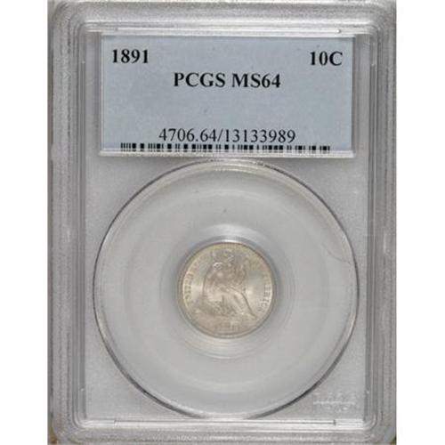 <B>1891 10C MS64 PCGS.</B></I> PCGS Population (182/137). NGC Census: (250/176). Mintage: 15,310,600. Numismedia Wsl. Price for NGC/PCGS coin in MS64: $320. (#4706)<BR><BR><b>Shipping:</b> Coins & Currency (<a target="_blank" href="http://www.heritageauctions.com/common/shipping.php">view shipping information</a>)