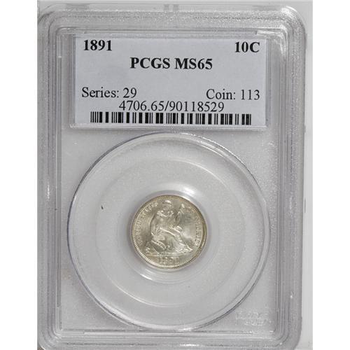 <B>1891<10C> MS65 PCGS.</B></I> This virtually untoned Gem has sharply defined features and great satiny luster. Only a few trivial marks are noted in the obverse fields.