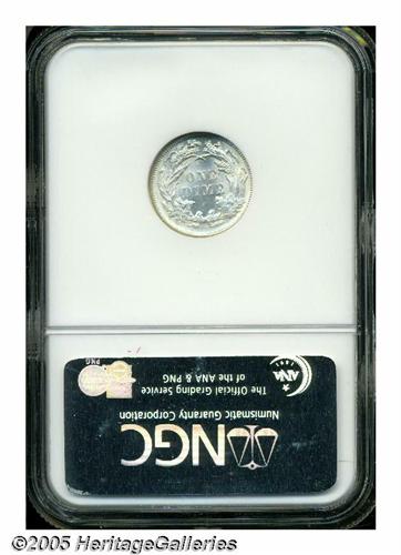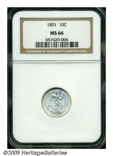 <B>1891<10C> MS66 NGC.</B></I> A brilliant and highly lustrous final year premium Gem. The strike is good, although not quite full on the face and the wreath bow. Mint-made die breaks are noted on the obverse border between 3 and 5 o'clock. Population: 50 in 66, 13 finer (5/05).