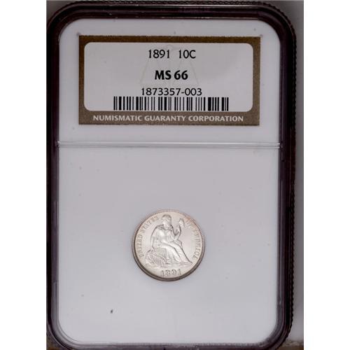 <B>1891<10C> MS66 NGC.</B></I> Well struck and nearly untoned with a pleasing satiny sheen and carefully preserved surfaces. An original Premium Gem example of this popular final-year issue. Census: 51 in 66, 16 finer (3/06).