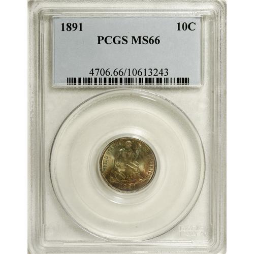 <B>1891 10C MS66 PCGS.</B></I> A lovely example from the final year of the design that sports magenta, orange, and emerald patina over each side. The luster is strong, though parts of the highpoints lack some detail. Population: 48 in 66, 6 finer (11/06).<BR><BR><b>Shipping:</b> Coin/Currency (<a target="_blank" href="http://www.heritageauctions.com/common/shipping.php">view shipping information</a>)