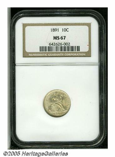 <B>1891<10C> MS67 NGC.</B></I> Generally well struck, except on the lowest portions of the wreath, with a bright satiny sheen illuminating the untoned alabaster surfaces. Showing faint die clash marks (as struck) on the obverse, the piece seems impeccably preserved and entirely free of post-strike defects. A great Superb Gem. Population: 12 in 67, 1 finer (4/05).