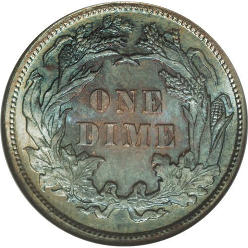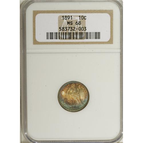 <B>1891 10C MS68 NGC.</B></I> The Seated dime series ended with its highest mintage at Philadelphia, in excess of 15 million pieces. Unsurprisingly, type collectors flock to this issue, and many contemporary numismatists saved attractive examples. Though many such examples appear today as Premium Gems and even Superb Gems, just one coin transcends the latter category.<BR> This frosty and practically perfect piece exhibits excellent detail and colorful patina. Zones of blue-green, navy, reddish-orange, and gold appear on the obverse, while the reverse has aquamarine and celery colors around a small rose-violet center. The surfaces appear flawless to the unaided eye, and the overall eye appeal is stellar. The <I>only</B></I> MS68 example graded by NGC, with no such coin certified by PCGS and none finer at either service (4/07).<BR><BR><b>Shipping:</b> Coins & Currency (<a target="_blank" href="http://www.heritageauctions.com/common/shipping.php">view shipping information</a>)