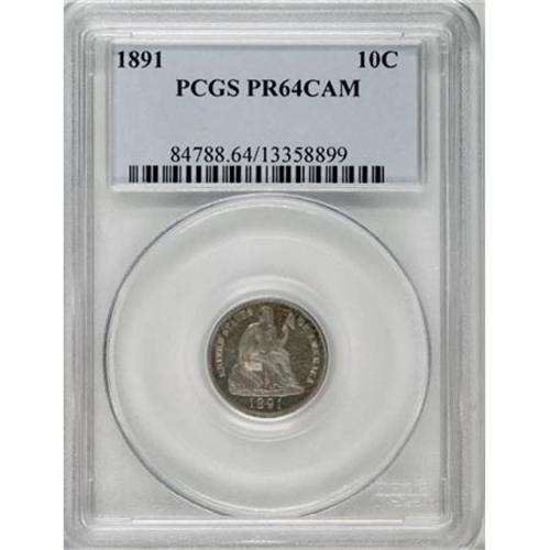 <B>1891 10C PR64 Cameo PCGS.</B></I> A distinctly contrasted near-Gem example of the final proof Seated dime issue, boldly struck with only a few faint hairlines in the fields. Orange and reddish-gold patina over the fields contrasts with the largely silver-gray devices. Population: 10 in 64 Cameo, 13 finer (2/08).<BR><BR><b>Shipping:</b> Coins & Currency (<a target="_blank" href="http://www.heritageauctions.com/common/shipping.php">view shipping information</a>)