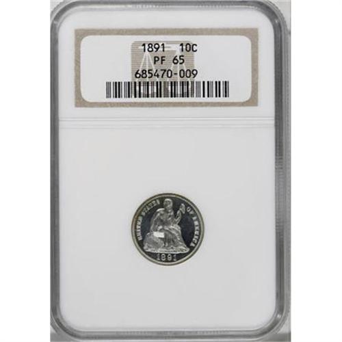 <B>1891 10C PR65 NGC.</B></I> Minimally toned with deeply reflective surfaces and undeniable eye appeal. Carefully preserved and enticing, though a handful of tiny strike-through depressions are noted to the left of Liberty.<BR><BR><B>Coin Engraver:</B> Christian Gobrecht<BR><BR><b>Shipping:</b> Coins & Currency (<a target="_blank" href="http://www.heritageauctions.com/common/shipping.php">view shipping information</a>)