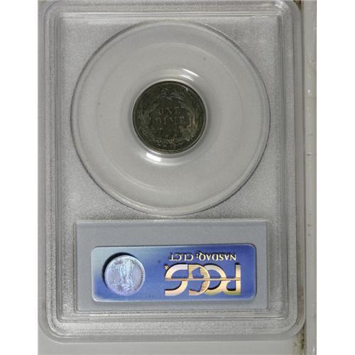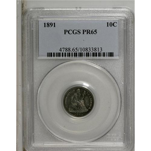 <B>1891 10C PR65 PCGS.</B></I> Deep blue-violet patina partly obscures the moderate mirrors of this final-year Gem. A few streaks of lavender are noted on the obverse. Population: 35 in 65, 26 finer (10/06).<BR><BR><b>Shipping:</b> Coin/Currency (<a target="_blank" href="http://www.heritageauctions.com/common/shipping.php">view shipping information</a>)