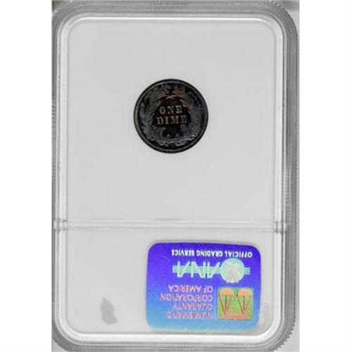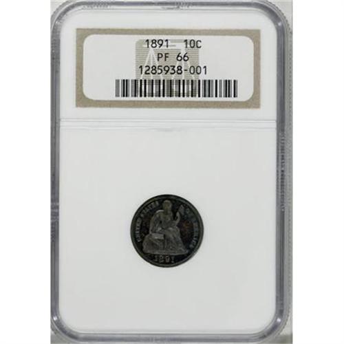 <B>1891 10C PR66 NGC.</B></I> The final proof Seated dime issue, which consisted of only 600 pieces, is represented here by a lovely Premium Gem. Sea-green toning at the margins yields to blue-green in the centers, with an additional core of rose noted within the wreath on the reverse. Census: 25 in 66, 23 finer (10/07).<BR><BR><B>Coin Engraver:</B> Christian Gobrecht<BR><BR><b>Shipping:</b> Coins & Currency (<a target="_blank" href="http://www.heritageauctions.com/common/shipping.php">view shipping information</a>)
