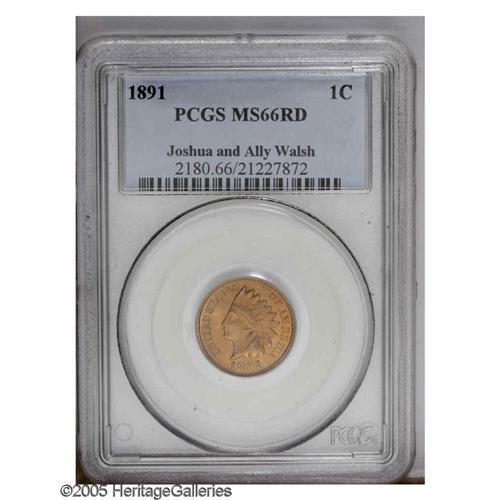 <B>1891<1C> MS66 Red PCGS.</B></I> Ex: Richard Collection. Rich, deep, blazing cherry-red color is seen over both sides of this original Gem. Sharply defined throughout, there are no obvious or detracting abrasions, just a few tiny specks of carbon on each side. Population: 6 in 66, 0 finer (11/05).<BR><I>From The Joshua and Ally Walsh Collection of United States Cents.</B></I>