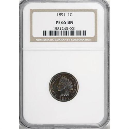 <B>1891 1C PR65 Brown NGC.</B></I> Electric-blue and violet-magenta shades enliven the chocolate-brown base of this boldly struck Gem. A fascinating and well-preserved exemplar with undeniable visual appeal. Census: 11 in 65 Brown, 6 finer (10/07).<BR><BR><B>Coin Engraver:</B> James B. Longacre<BR><BR><b>Shipping:</b> Coins & Currency (<a target="_blank" href="http://www.heritageauctions.com/common/shipping.php">view shipping information</a>)