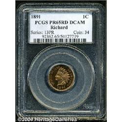 <B>1891<1C> PR65 Deep Cameo PCGS.</B></I> Ex: Richard Collection. The reverse has consistent and bright orange color, while the obverse intermingles orange, rose, and aqua iridescence. This needle-sharp Gem exhibits imposing Deep Cameo contrast, and the unmarked surfaces are nearly carbon-free. As of (9/04), the only 1891 Cent certified as Deep Cameo by PCGS. <BR><BR><B>Important notice:</B> Heritage usually auctions material at the rate of 200-250 lots per hour. On some occasions eBay Live bid software or the Internet may not be able to keep up with the pace of the auction. We recommend placing a realistic absentee bid now as insurance to avoid disappointment. Occasionally the auctioneer may eliminate or reject an eBay Live bid, and the auctioneer may also reopen a lot after the close of the eBay live bidding (usually because we missed an audience bid), and may reject your bid even if it shows you as the winning bidder. By bidding via eBay Live, you agree that Heritage may award the lot to another bidder at its sole discretion under the circumstances described above or any other reasonable circumstances. Since eBay bids are not shown to us until we open the lot on the floor, we treat those bids just like floor bids. In most cases the floor responds before the eBay bid is presented to us, due to Internet lag time, so for consistency we have made it a policy that floor bids are always considered first over tie eBay live bids. Also please note that all Heritage lots purchased through eBay Live carry a 20% Buyer's Premium. Please make sure you read the Terms and Conditions before you bid.