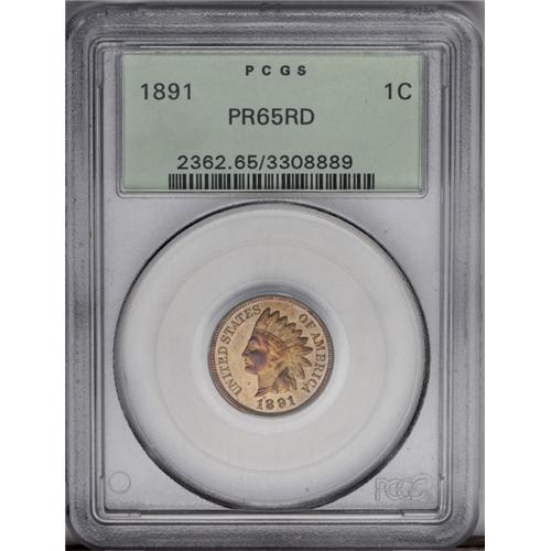 <B>1891<1C> PR65 Red PCGS.</B></I> This boldly struck piece has a light gold obverse field and a rich orange reverse. Ruby-red and sea-green freckles visit the denomination and occupy the cheek. A less obtainable 1890s proof Indian in Gem Red condition. Housed in a green label holder. Population: 14 in 65 Red, 4 finer (4/06).<BR><I>From The Empire Tree Collection.</B></I>