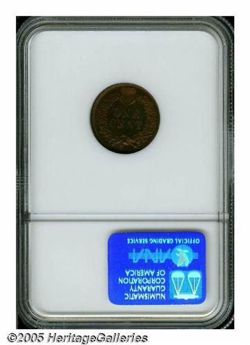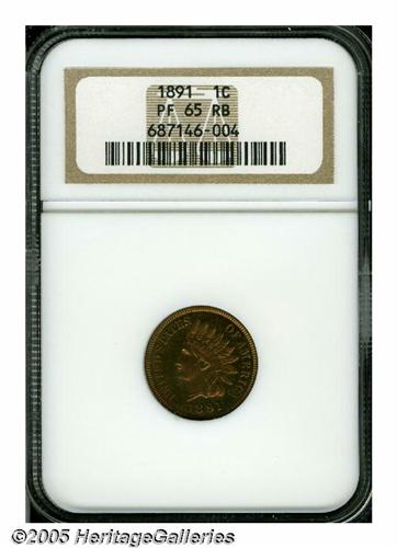 <B>1891<1C> PR65 Red and Brown NGC.</B></I> Golden-tan and crimson patina bathes bright proof surfaces that display some field to motif contrast. The design elements are exquisitely struck. A few tiny flecks are scattered over the obverse. Population: 42 in 65, 5 finer (5/05).