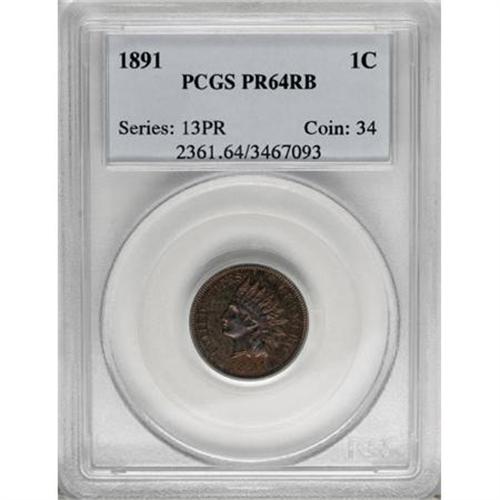 <B>1891 1C PR64 Red and Brown PCGS.</B></I> PCGS Population (105/28). NGC Census: (64/48). Mintage: 2,350. Numismedia Wsl. Price for NGC/PCGS coin in PR64: $252. (#2361)<BR><BR><B>Coin Engraver:</B> James B. Longacre<BR><BR><b>Shipping:</b> Coins & Currency (<a target="_blank" href="http://www.heritageauctions.com/common/shipping.php">view shipping information</a>)