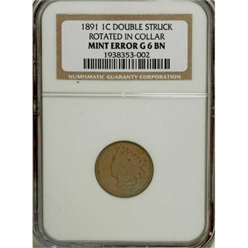 <B>1891 1C Indian Cent--Double Struck Rotated in Collar--Good 6 NGC.</B></I> After the initial normal strike, this cent remained in the collar instead of ejecting. No other planchet was fed in, but the cent rotated 90 degrees clockwise prior to the second strike. Despite its curious appearance, the cent apparently remained in circulation for some time. A lamination is noted above the N in ONE, and a thin mark is concealed on a lower headdress feather.<BR><BR><B>Coin Engraver:</B> James B. Longacre<BR><BR><b>Shipping:</b> Coins & Currency (<a target="_blank" href="http://www.heritageauctions.com/common/shipping.php">view shipping information</a>)
