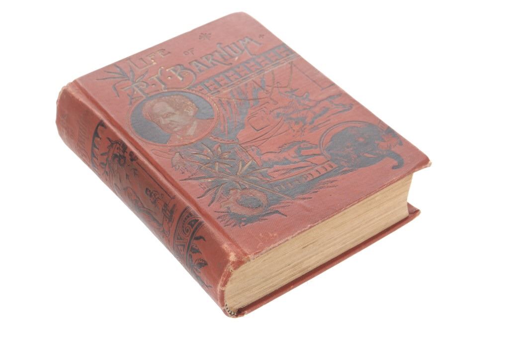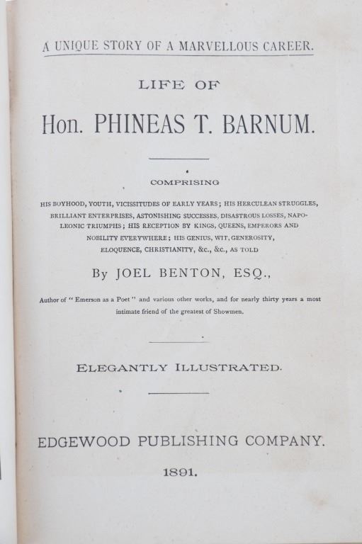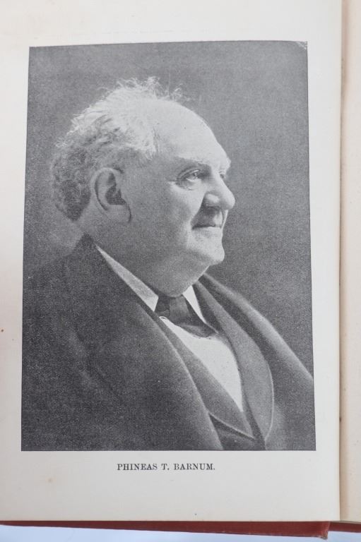 Featured in this lot is this scarce first edition of "Life of Barnum; The World Renowned Showman" written by P.T. Barnum and published circa 1891. Phineas Taylor Barnum was an American showman, politician, businessman, and founder of the Barnum and Bailey Circus in 1871. This book serves as a comprehensive autobiography. The cover features a wonderful gilt decorated and illustrated cover. The inside of the book contains numerous illustrations, including those of P.T. Barnum and his wife. The book is in good-to-very good condition. The measurements are 8" x 6".