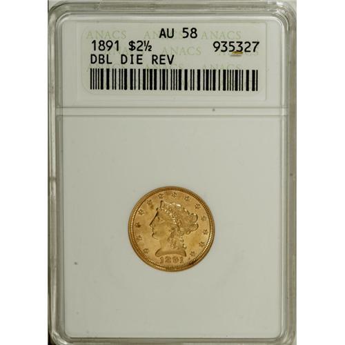 <B>1891 $2 1/2 --Double Die Reverse--AU58 ANACS.</B></I> NGC Census: (35/162). PCGS Population (33/137). Mintage: 10,900. Numismedia Wsl. Price for NGC/PCGS coin in AU58: $320. (#7843)<BR><BR><b>Shipping:</b> Coins & Currency (<a target="_blank" href="http://www.heritageauctions.com/common/shipping.php">view shipping information</a>)