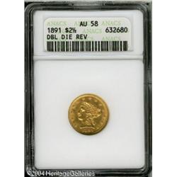 1891 $2 1/2 --Doubled Die Reverse--AU58 ANACS. A lu <B>1891 $2 1/2 --Doubled Die Reverse--AU58 ANACS.</B></I> A lustrous piece that has little evidence of highpoint friction, although the obverse has a couple of faint pinscratches. AMERICA and the right border of the eagle are prominently die doubled, which is a diagnostic for business strikes of this date. Less than 11,000 pieces were struck. <BR><BR><B>Important notice:</B> Heritage usually auctions material at the rate of 200-250 lots per hour. On some occasions eBay Live bid software or the Internet may not be able to keep up with the pace of the auction. We recommend placing a realistic absentee bid now as insurance to avoid disappointment. Occasionally the auctioneer may eliminate or reject an eBay Live bid, and the auctioneer may also reopen a lot after the close of the eBay live bidding (usually because we missed an audience bid), and may reject your bid even if it shows you as the winning bidder. By bidding via eBay Live, you agree that Heritage may award the lot to another bidder at its sole discretion under the circumstances described above or any other reasonable circumstances. Since eBay bids are not shown to us until we open the lot on the floor, we treat those bids just like floor bids. In most cases the floor responds before the eBay bid is presented to us, due to Internet lag time, so for consistency we have made it a policy that floor bids are always considered first over tie eBay live bids. Also please note that all Heritage lots purchased through eBay Live carry a 20% Buyer's Premium. Please make sure you read the Terms and Conditions before you bid. This lot is being auctioned in conjunction with a live floor auction by Heritage Galleries & Auctioneers. All final auction and invoice information will be supplied by Heritage Galleries & Auctioneers, and all other information should be considered preliminary. Lot:6520