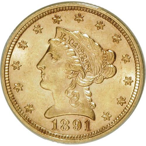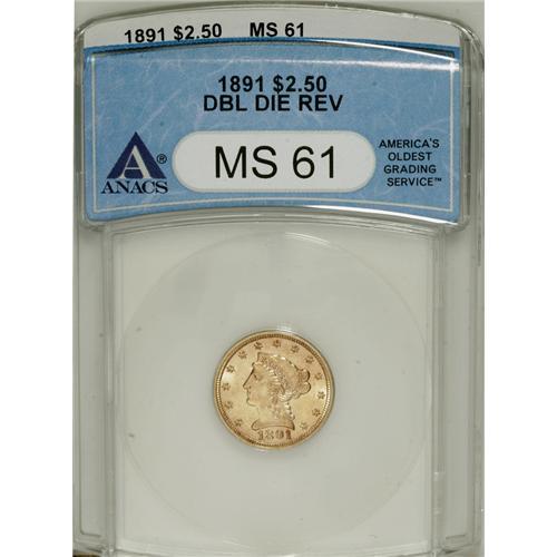 <B>1891 $2 1/2 MS61 ANACS.</B></I> Double Die Reverse. PCGS Population (17/107). NGC Census: (32/123). Mintage: 10,900. Numismedia Wsl. Price for NGC/PCGS coin in MS61: $367. (#7843)<BR><BR><b>Shipping:</b> Coins & Currency (<a target="_blank" href="http://www.heritageauctions.com/common/shipping.php">view shipping information</a>)