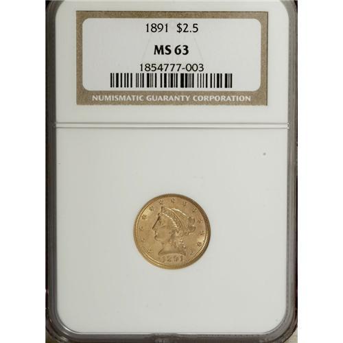 <B>1891 $2 1/2 MS63 NGC.</B></I> NGC Census: (60/64). PCGS Population (25/30). Mintage: 10,900. Numismedia Wsl. Price for NGC/PCGS coin in MS63: $825. (#7843)<BR><BR><b>Shipping:</b> Coins & Currency (<a target="_blank" href="http://www.heritageauctions.com/common/shipping.php">view shipping information</a>)