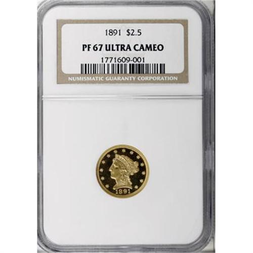 <B>1891 $2 1/2 PR67 Ultra Cameo NGC.</B></I> Among American engravers and designers who have found employment with the U.S. Mint, few have had the far-reaching influence and design longevity of Christian Gobrecht. The talented artist, who had performed die work for the Mint since the 1820s, and following the stroke suffered by William Kneass, then Chief Engraver, Gobrecht became a full-time employee as an assistant engraver. Despite the title, Gobrecht did virtually all of the die work and design for the Mint in the last decade of his life, and by the time he succeeded to the Chief Engraver's post on the death of Kneass, Gobrecht's designs graced every silver and gold denomination struck by the Mint.<BR> Though Gobrecht's work possessed incredible longevity and artistic power (the esteemed Augustus Saint-Gaudens drew inspiration from Gobrecht's Flying Eagle motif for the silver dollar), his once-esteemed creations eventually fell out of favor, and after more than half a century of Seated silver coinage, change was inevitable. The year 1891 marked the last appearance of the Liberty Seated image on circulating coinage. Yet Gobrecht's Coronet gold design remained, and it lasted more than a decade afterward.<BR> This magnificent Superb Gem proof, one of the most esteemed survivors among the quarter eagle specimens from that noteworthy year, offers virtually immaculate honey-gold fields that have seemingly fathomless mirrors. Moderate frost on the decisively struck central devices adds undeniable contrast. A specimen at the height of preservation and visual appeal for the issue; NGC has graded just three Ultra Cameo coins as PR67 and none finer (1/08).<BR><I>From The Ultra Collection.</B></I><BR><BR><b>Shipping:</b> Coins & Currency (<a target="_blank" href="http://www.heritageauctions.com/common/shipping.php">view shipping information</a>)
