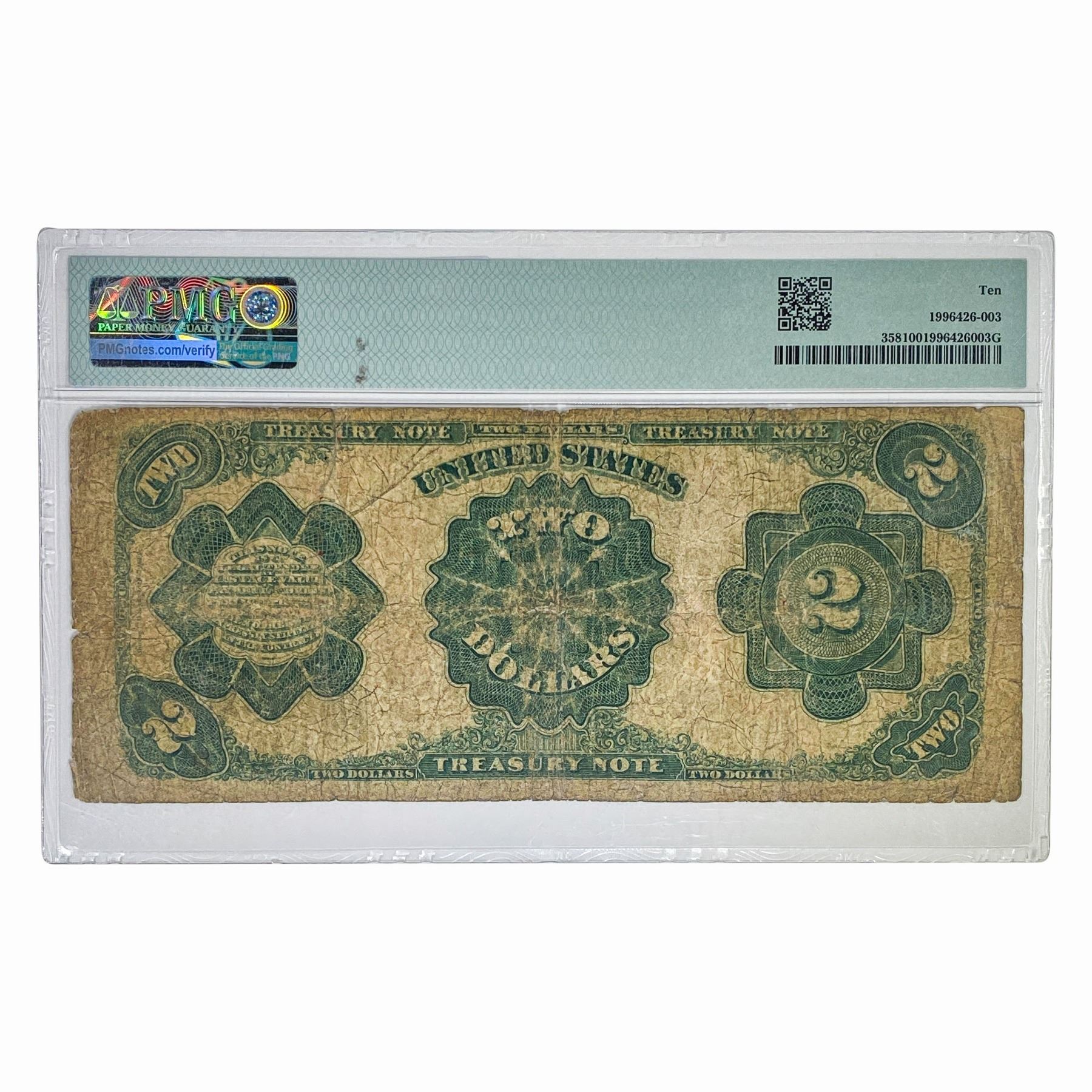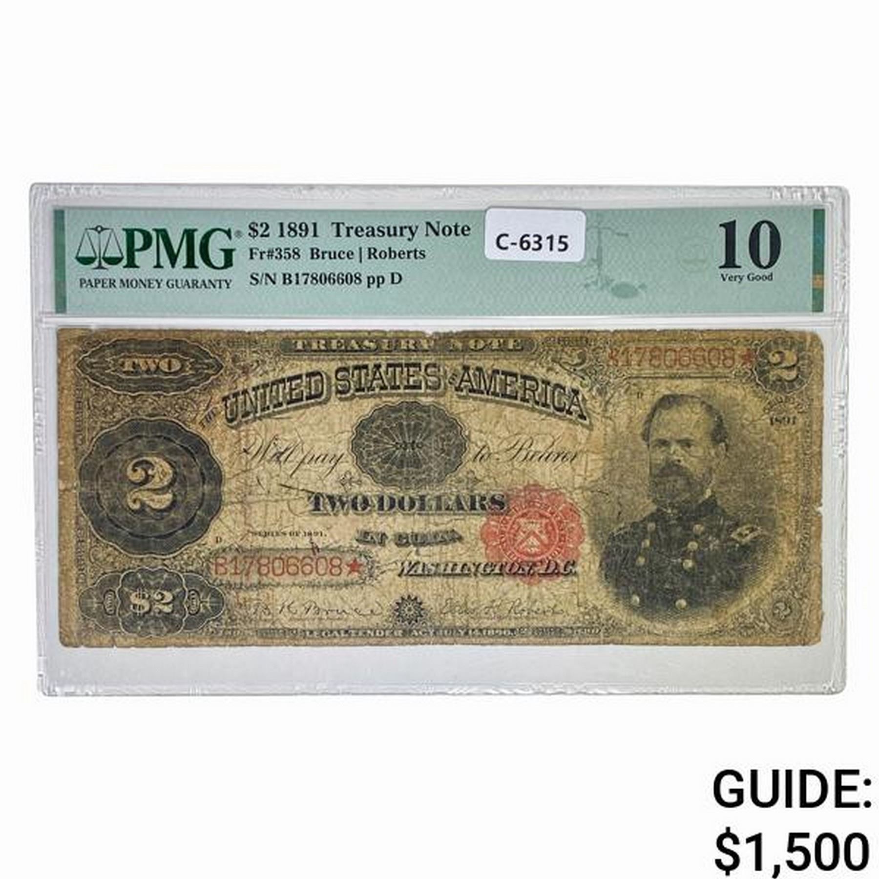 1891 $2 MCPHERSON TREASURY NOTE PMG VG-10