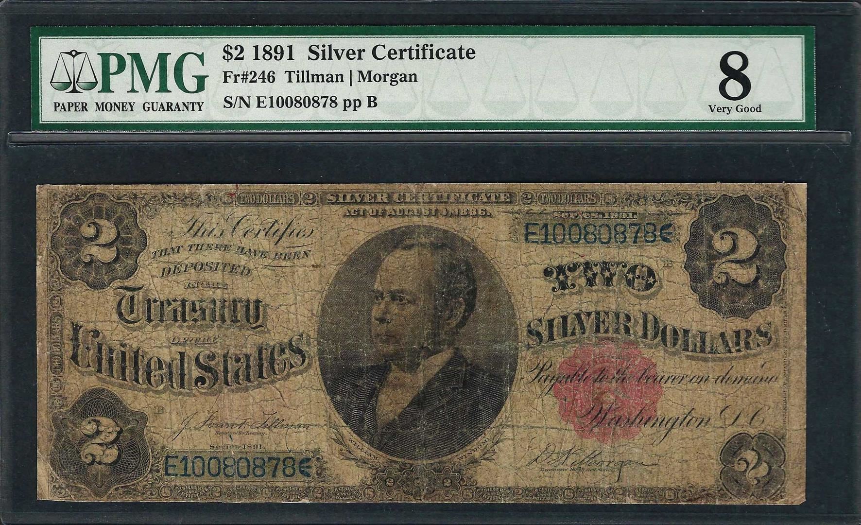 One 1891 $2 Silver Certificate Note Fr.246 PMG Very Good 8. PMG Certified.