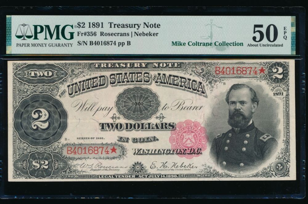 One 1891 $2 Treasury Note PMG 50EPQ.
