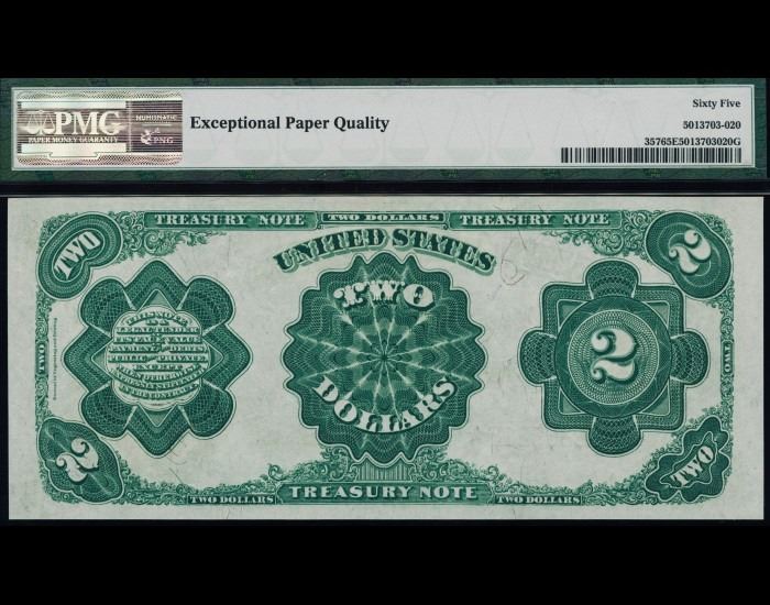 One 1891 $2 Treasury Note PMG 65EPQ.